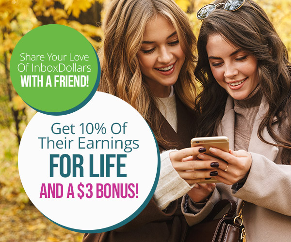 Get a $3 bonus when you refer a friend to InboxDollars. Plus, you'll get 10% of their earnings for life