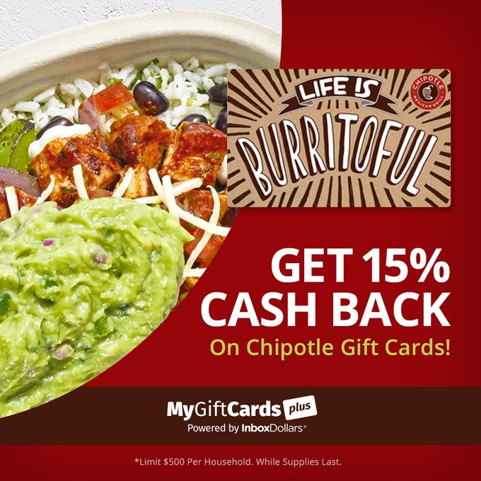 Get 15% Cash Back on Chipotle gift cards from MyGiftCardsPlus